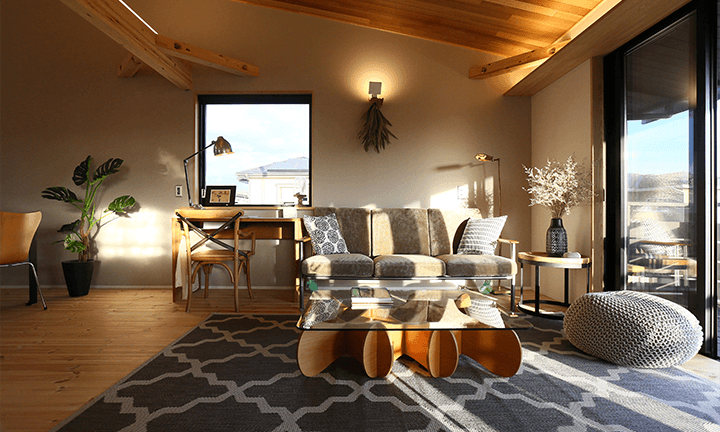 ゆるやかな2寸勾配の片流れ屋根、鎧張りの杉サイディングとガルバリウムのツートンの外壁、ワイドなウッドバルコニーとウッドデッキ、大開口の連続窓など、スタンダードで落ち着いた雰囲気を湛えながら、時代のニーズにもしっかり応えるスタイリッシュな佇まいです。内外から出入りできる土間仕様のホビールームは暮らしを楽しく豊かにしてくれます。